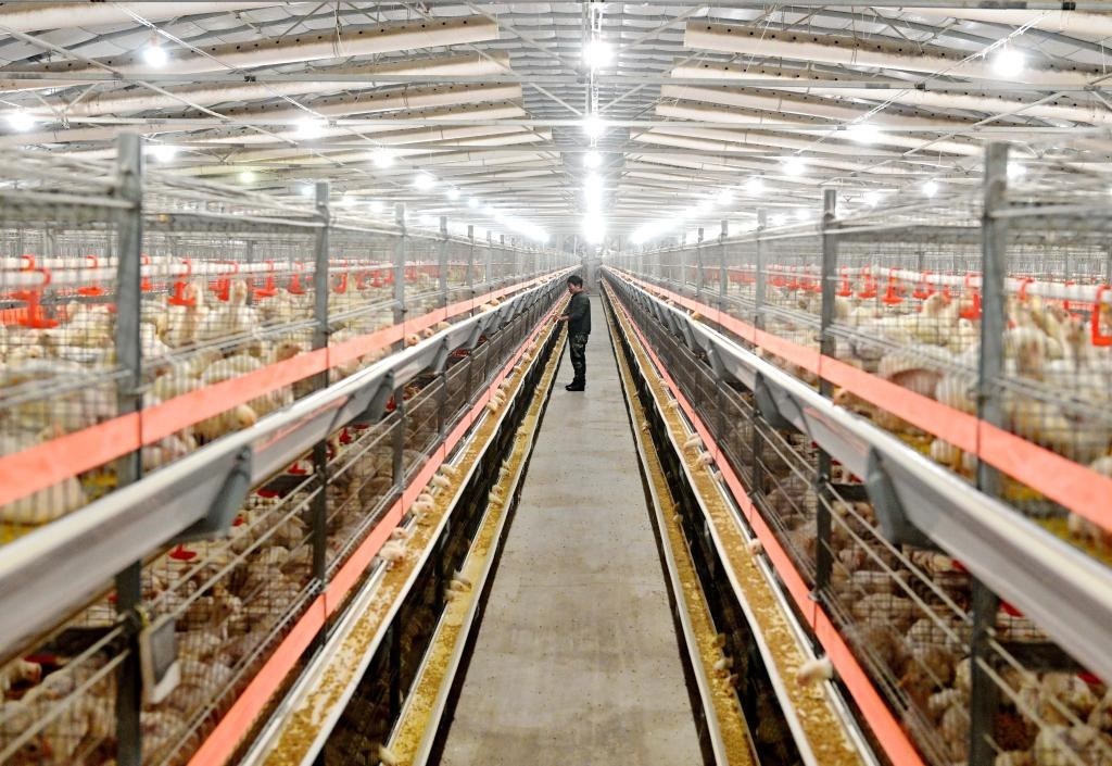 ?2023年12月16日,河北省灤州市灤城街道辦事處楊家院村一家肉雞養(yǎng)殖合作社的社員在雞舍內(nèi)工作。 新華社記者楊世堯攝