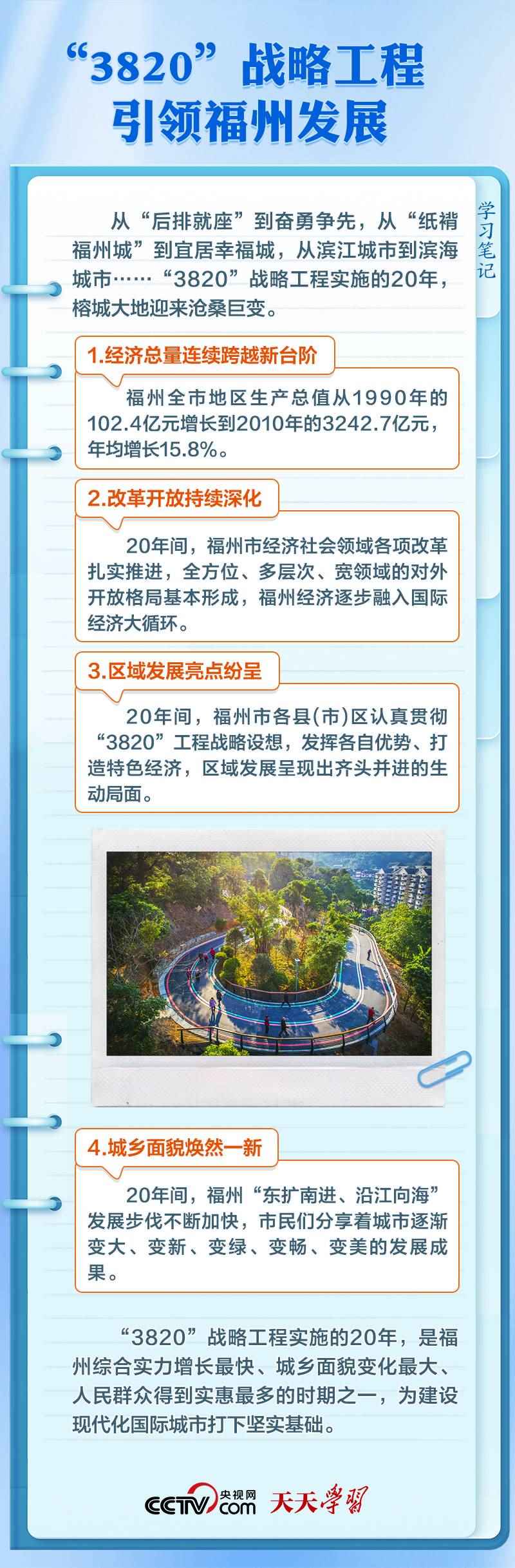 三十多年來,福州堅(jiān)持“3820”戰(zhàn)略工程思想精髓不動(dòng)搖,一張藍(lán)圖繪到底,不斷開創(chuàng)現(xiàn)代化國(guó)際城市建設(shè)的嶄新局面?!?820”戰(zhàn)略是如何制定的?其思想精髓和時(shí)代價(jià)值有哪些?央視網(wǎng)《天天學(xué)習(xí)》欄目與您一起學(xué)習(xí)領(lǐng)悟。