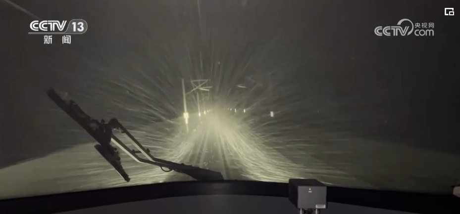從零時(shí)15分開始到清晨4點(diǎn)多,熱滑除冰車分別駛過鄭州東、黃河大橋、新鄉(xiāng)和南樂,車窗外白雪皚皚,視線和視野都受到限制。一路上,雨滴和雪粒不斷敲打著車窗,從接觸網(wǎng)上掉落的冰碴,不斷落在車頂上砰砰作響,銅基受電弓在結(jié)冰的接觸網(wǎng)上拉出長(zhǎng)長(zhǎng)的電弧,噼里啪啦電光四射。