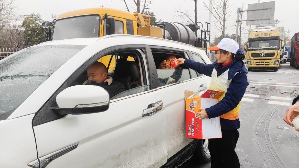 為讓滯留人員能吃上暖心飯,當地黨委政府組織志愿者送來免費的方便面、八寶粥、熱水等。