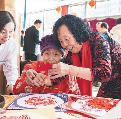 內(nèi)蒙古自治區(qū)呼和浩特市,老人在和養(yǎng)老院志愿者剪窗花。丁根厚攝(影像中國)