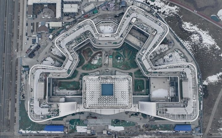 這是位于雄安新區(qū)啟動區(qū)內(nèi)的中國衛(wèi)星網(wǎng)絡(luò)集團有限公司總部大樓建設(shè)現(xiàn)場(2024年1月31日攝,無人機照片)。新華社記者 牟宇 攝