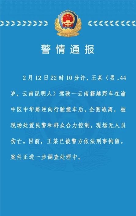 ·重慶解放碑一男子駕車逆行撞車后企圖逃離被刑拘,警方通報(bào)。