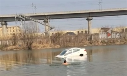 ·江蘇南通一釣友忘拉手剎,汽車滑下臺階墜入魚塘。