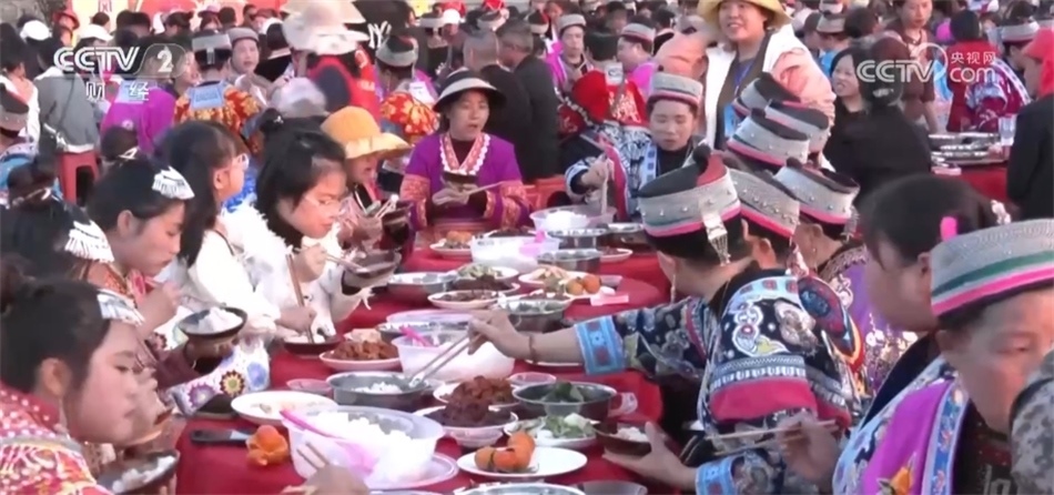 隨后,三合苗寨圍繞著“花樹”擺起長(zhǎng)桌宴,苗族同胞和游客們一起喝起水花酒、跳起蘆笙舞,一起歡慶新春到來(lái)。今年春節(jié)期間,安順各地將舉行上百場(chǎng)苗族跳花活動(dòng)。