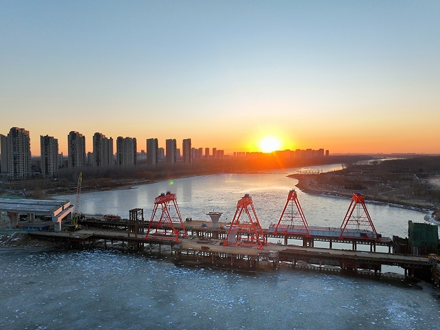 1月15日拍攝的建設(shè)中的廠通路潮白河大橋(無人機照片)。新華社記者 邢廣利 攝