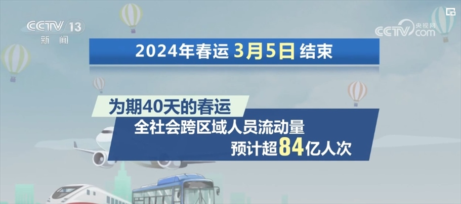 2024年春運3月5日結(jié)束,為期40天的春運全社會跨區(qū)域人員流動量預計超84億人次。其中,鐵路客運量預計完成4.8億人次;公路人員流動量預計完成78.3億人次,其中,高速公路及普通國省道非營業(yè)性小客車人員出行量預計完成67.2億人次,在全社會跨區(qū)域人員流動量中占比約80%,公路營業(yè)性客運量預計完成11.1億人次;水路客運量預計完成2900萬人次;民航客運量預計完成8300萬人次。