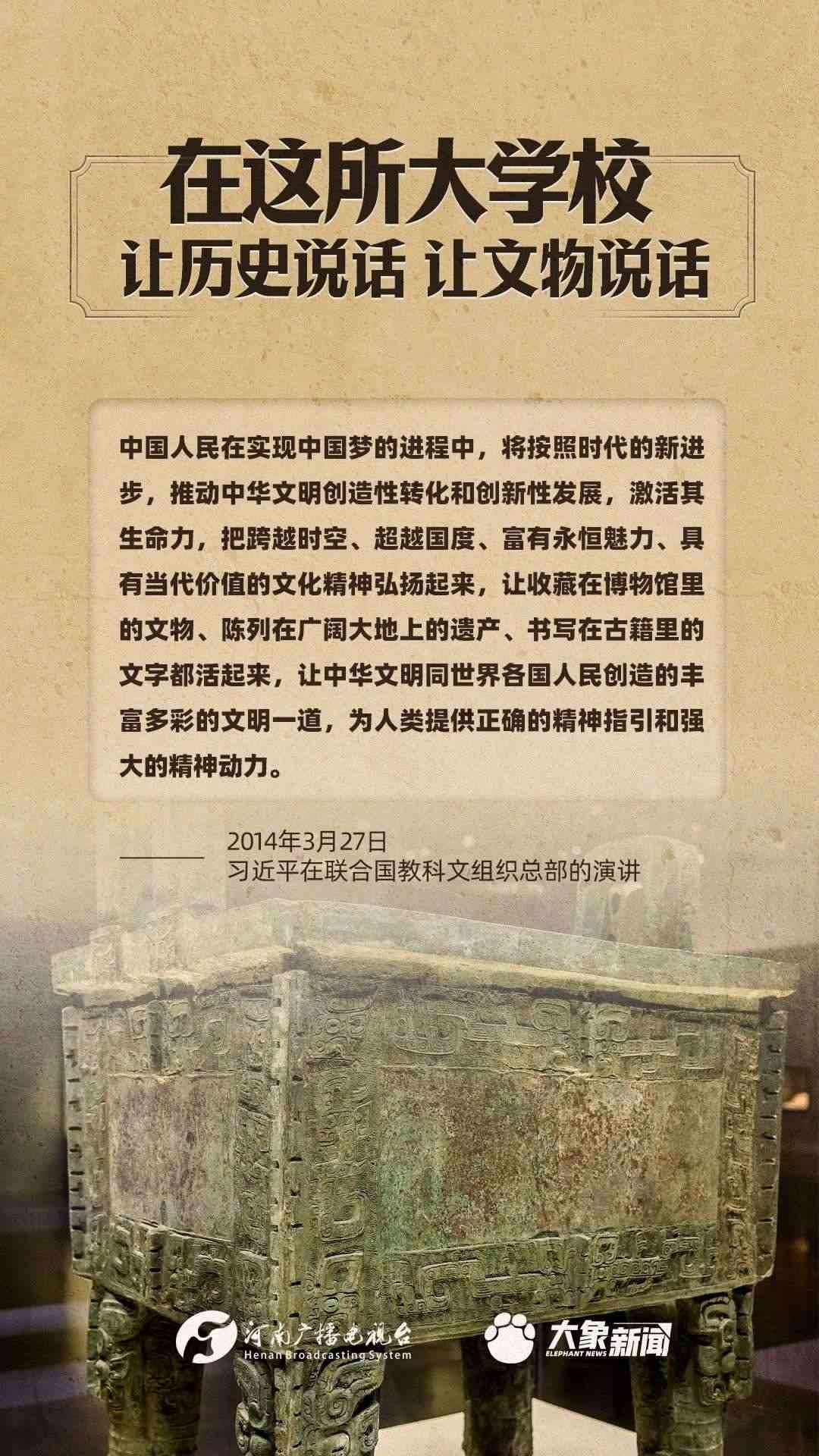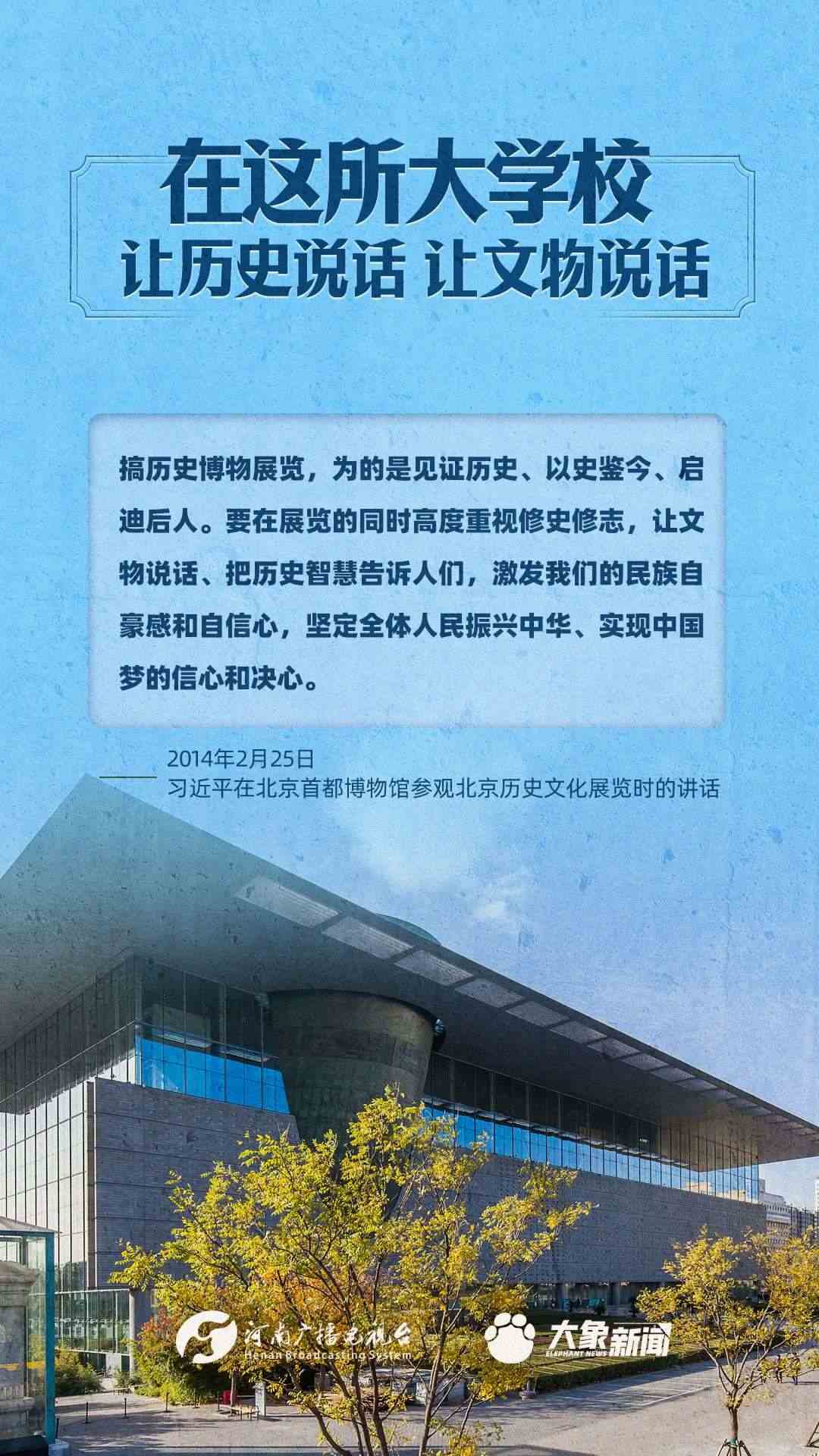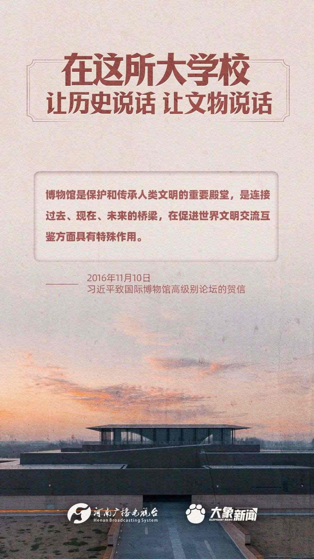 習近平總書記一直高度重視博物館工作,多次作出重要講話,強調“一個博物院就是一所大學?!?,指出“讓歷史說話,讓文物說話”,要求“守護好、傳承好、展示好中華文明優(yōu)秀成果”等等,金句連連。大象新聞進行了認真梳理,邀您一起學習。
