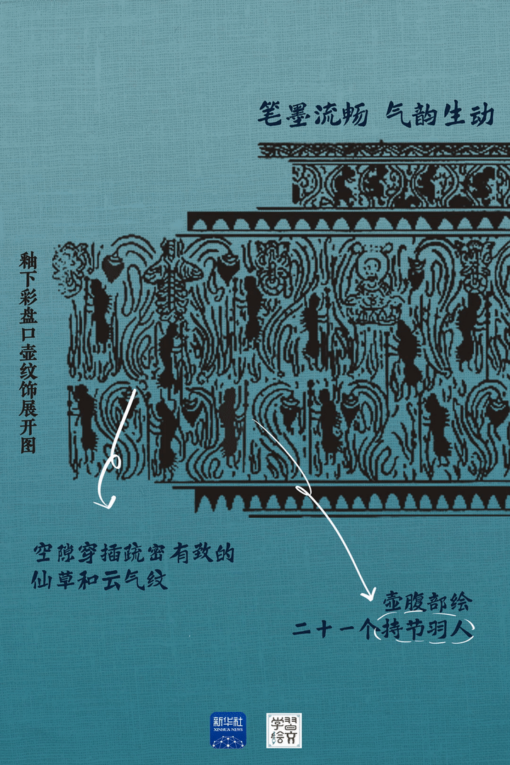 “這件藏于六朝博物館的青瓷釉下彩羽人紋盤口壺于1983年出土,精湛的釉下彩繪工藝,改變了人們對(duì)釉下彩工藝始于唐代的認(rèn)識(shí),把我國釉下彩繪工藝出現(xiàn)的時(shí)間提前了近五百年?!彼窝嗾f。