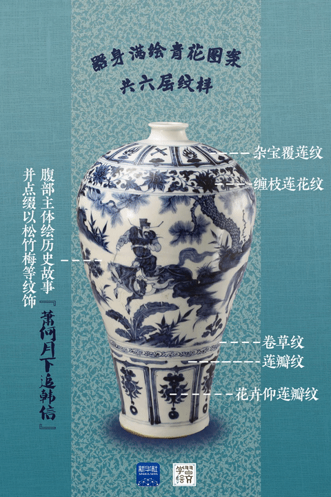 “元代是中國陶瓷史上不容忽視的重要時(shí)期?!彼窝嘟榻B,這件藏于南京市博物館的元青花蕭何月下追韓信圖梅瓶向人們展示了元代制瓷水平。