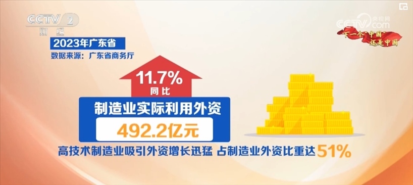 廣東省商務(wù)廳數(shù)據(jù)顯示,2023年全省新設(shè)制造業(yè)外資企業(yè)1078家,同比增長(zhǎng)29.9%;制造業(yè)實(shí)際利用外資492.2億元,同比增長(zhǎng)11.7%。其中,高技術(shù)制造業(yè)吸引外資增長(zhǎng)迅猛,占制造業(yè)外資比重達(dá)51%。