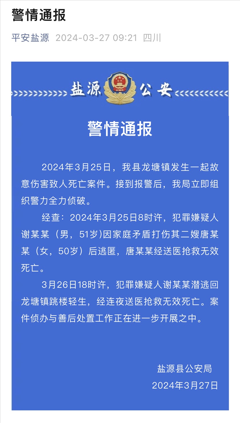 ·四川鹽源發(fā)生一起故意傷害致人死亡案 警方:男子打傷二嫂致死后逃匿跳樓身亡。