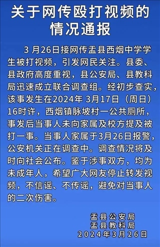 ·官方通報“山西盂縣一學(xué)生在公廁內(nèi)被打”:公安機(jī)關(guān)介入調(diào)查。