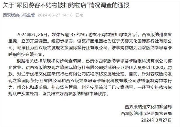 ·云南西雙版納通報“37名跟團(tuán)游客不購物被扣購物店”調(diào)查情況:立案調(diào)查。
