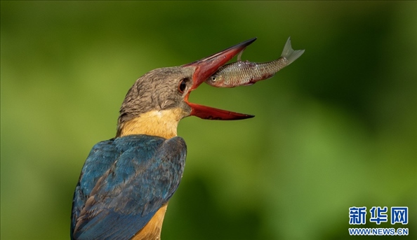 鸛嘴翡翠進食瞬間(3月30日攝)。新華網(wǎng)發(fā)(朱邊勇 攝)
