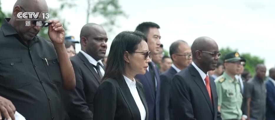 中國(guó)駐坦桑尼亞大使陳明健和坦桑尼亞工程和交通部長(zhǎng)姆巴拉瓦走上公墓石階,整理挽聯(lián)、鞠躬致敬,全體人員默哀并三鞠躬,緬懷長(zhǎng)眠于此的中國(guó)援建坦贊鐵路和其他援坦項(xiàng)目的專家。