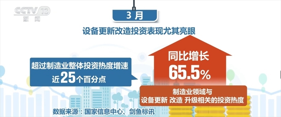制造業(yè)領(lǐng)域則更為突出,1—2月,制造業(yè)投資熱度指數(shù)同比增長13.3%,3月迅速提升至40.6%,遠(yuǎn)高于全國總體投資熱度增速。設(shè)備更新改造投資表現(xiàn)尤其亮眼,3月,制造業(yè)領(lǐng)域與設(shè)備更新、改造、升級(jí)相關(guān)的投資熱度同比增長65.5%,超過制造業(yè)整體投資熱度增速近25個(gè)百分點(diǎn)。