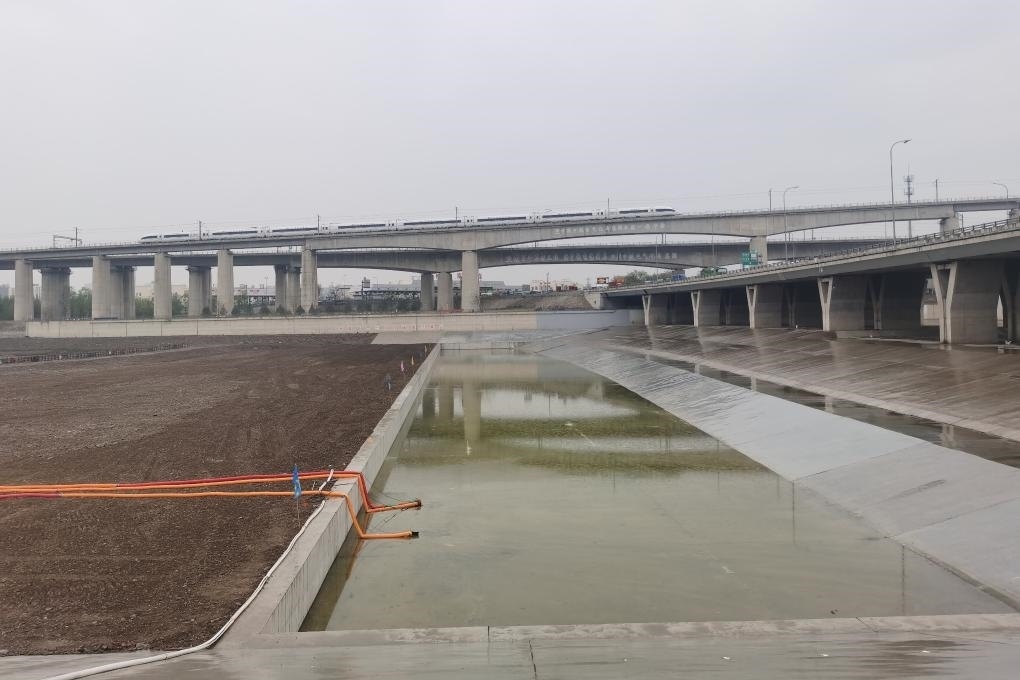 永定河京港澳高速公路大橋南,大寧調(diào)蓄水庫水毀修復(fù)工程施工現(xiàn)場(chǎng),記者看到,新建的消力池已經(jīng)建好,所有實(shí)體工程已經(jīng)完工,一些工人正在做收尾清理工作。