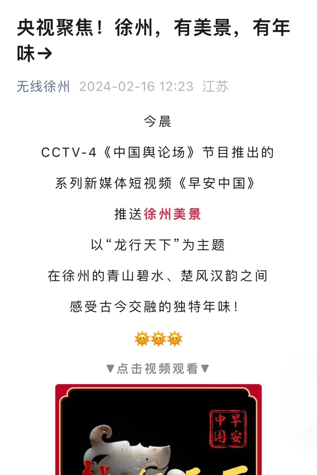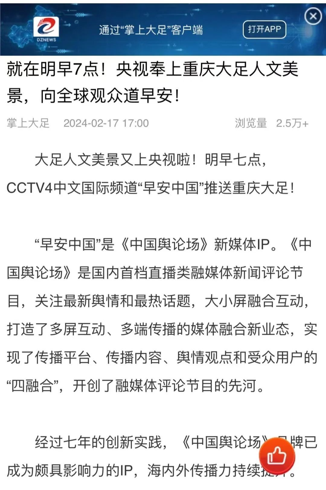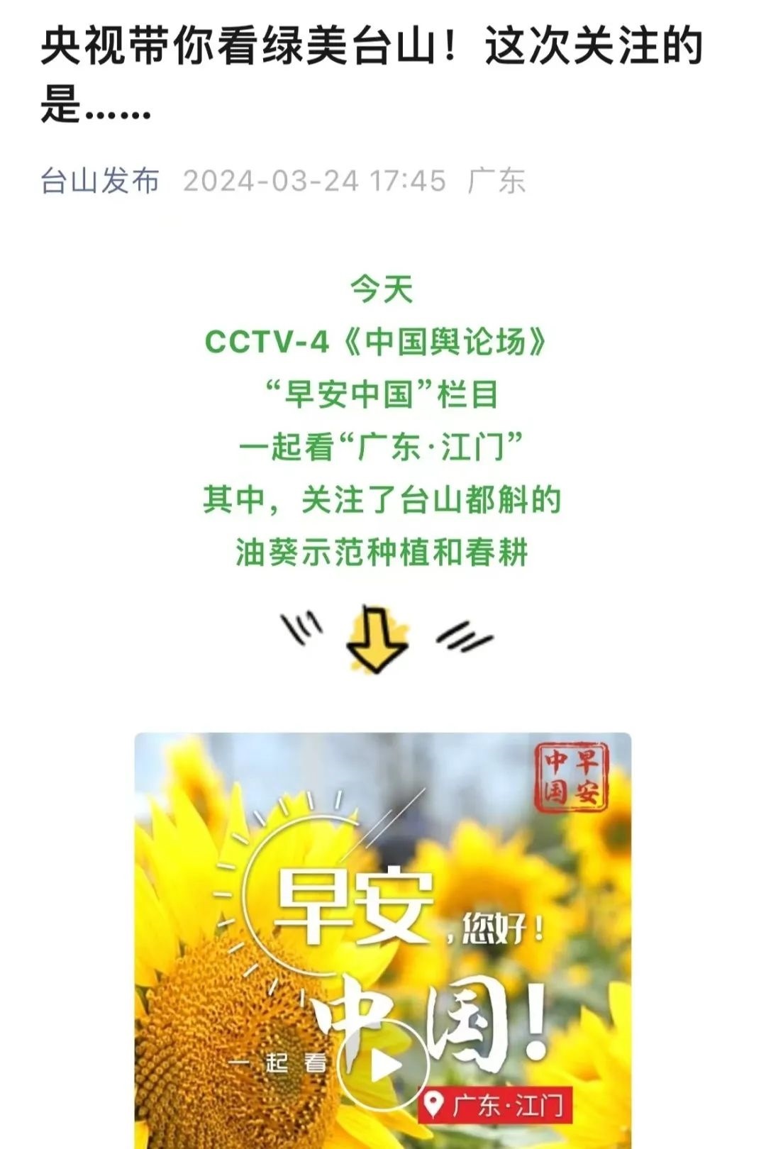 “央視帶你看綠美臺(tái)山,這次關(guān)注的是......”“就在明早7點(diǎn)!央視奉上重慶大足人文美景,向全球觀眾道早安!”“央視聚焦!徐州,有美景,有年味”“金葵向陽(yáng)開,中春好景和風(fēng)裁!美麗江門與您相遇央視《早安中國(guó)》”……越來越多的地方政府伸出橄欖枝,希望《早安中國(guó)》多“來”當(dāng)?shù)匾挥[好風(fēng)光。