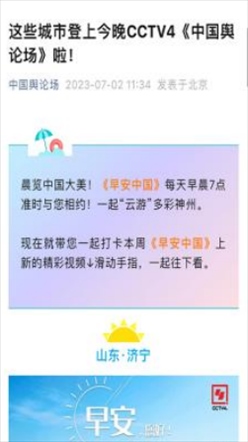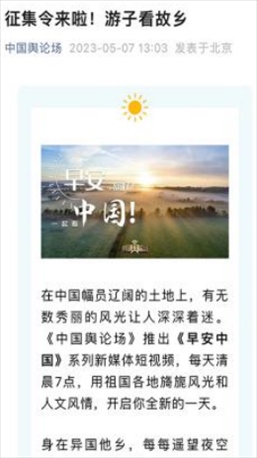每天早7點(diǎn),新媒體用戶一起床,打開《中國(guó)輿論場(chǎng)》,美妙的音樂喚醒耳朵,美麗的風(fēng)景賞心悅目,再加上一句經(jīng)典典故,迎接美美的一天!