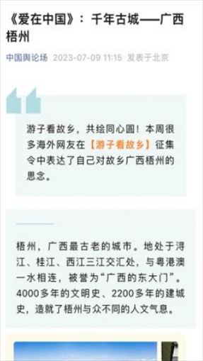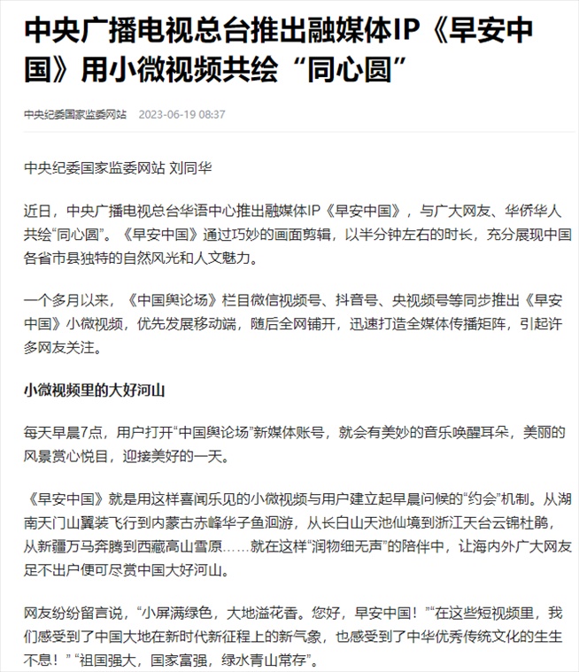 “早安中國(guó)切口新穎,有文化屬性和微記錄的氣質(zhì)?!薄懊看纹驳慕Y(jié)語(yǔ)字幕,都是從哪里選的?每天,都給我學(xué)習(xí)的機(jī)會(huì)?!薄皩I(yè)微記錄是媒體融合最寬廣的路?!薄对绨仓袊?guó)》真真切切地緩解了許多海內(nèi)外網(wǎng)友的故土思鄉(xiāng)情切,也收到了來自四面八方的認(rèn)可及反饋?!吨袊?guó)輿論場(chǎng)》節(jié)目持續(xù)發(fā)出“游子看故鄉(xiāng)”征集令,請(qǐng)海外華僑華人說出對(duì)家鄉(xiāng)的思念和心中最想“打卡”的祖國(guó)美景。