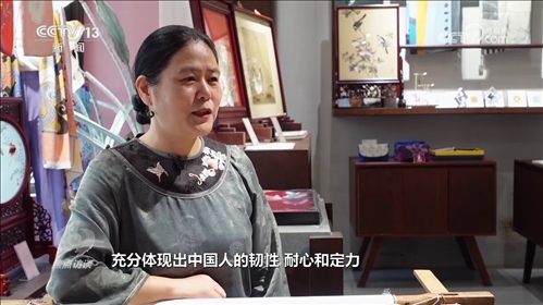 盧建英:“當(dāng)時(shí)我在繡一幅《桃花太平鳥圖》,習(xí)近平總書記走到了我的繃架前。他說你好,很親切,很和藹,看得非常仔細(xì)。他說中華文化的傳承力有多強(qiáng),通過這個(gè)蘇繡可以看出來,像這樣的功夫充分體現(xiàn)出中國(guó)人的韌性、耐心和定力,這是中華民族精神的一部分,能得到總書記的認(rèn)可,真的是倍感榮耀?!?/p>