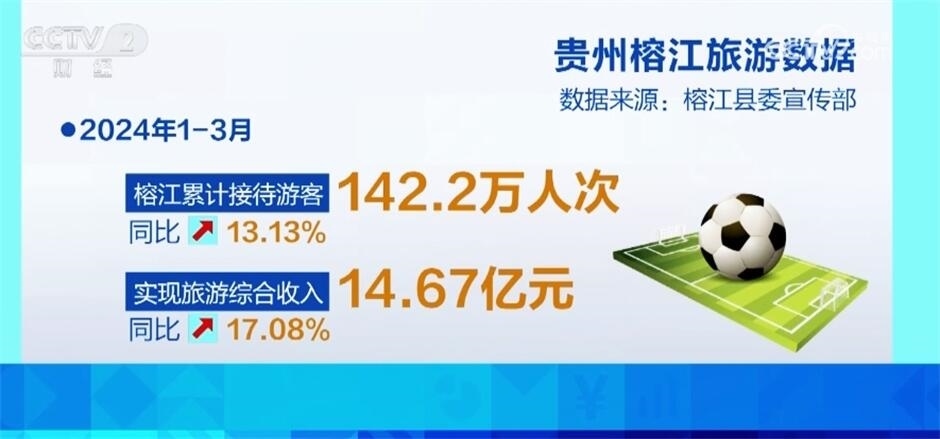 在“村超”流量的帶動下,2024年1—3月榕江累計(jì)接待游客142.2萬人次,同比增長13.13%,實(shí)現(xiàn)旅游綜合收入14.67億元,同比增長17.08%。