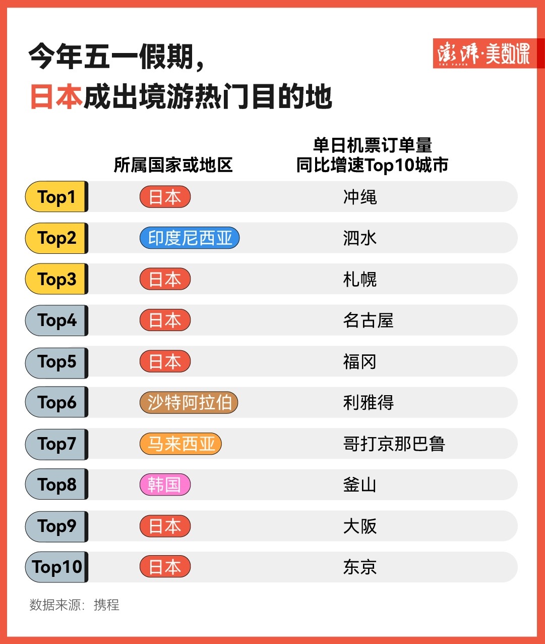 除了國(guó)內(nèi)旅游市場(chǎng)的火爆之外,“五一”出境游已經(jīng)加快復(fù)蘇。從攜程提供的數(shù)據(jù)看,今年“五一”假期,日本成了出境游熱門目的地——相比2023年同期,單日機(jī)票訂單量同比增速Top10的城市中,日本的沖繩、札幌、名古屋等城市分別占據(jù)了六個(gè)席位。