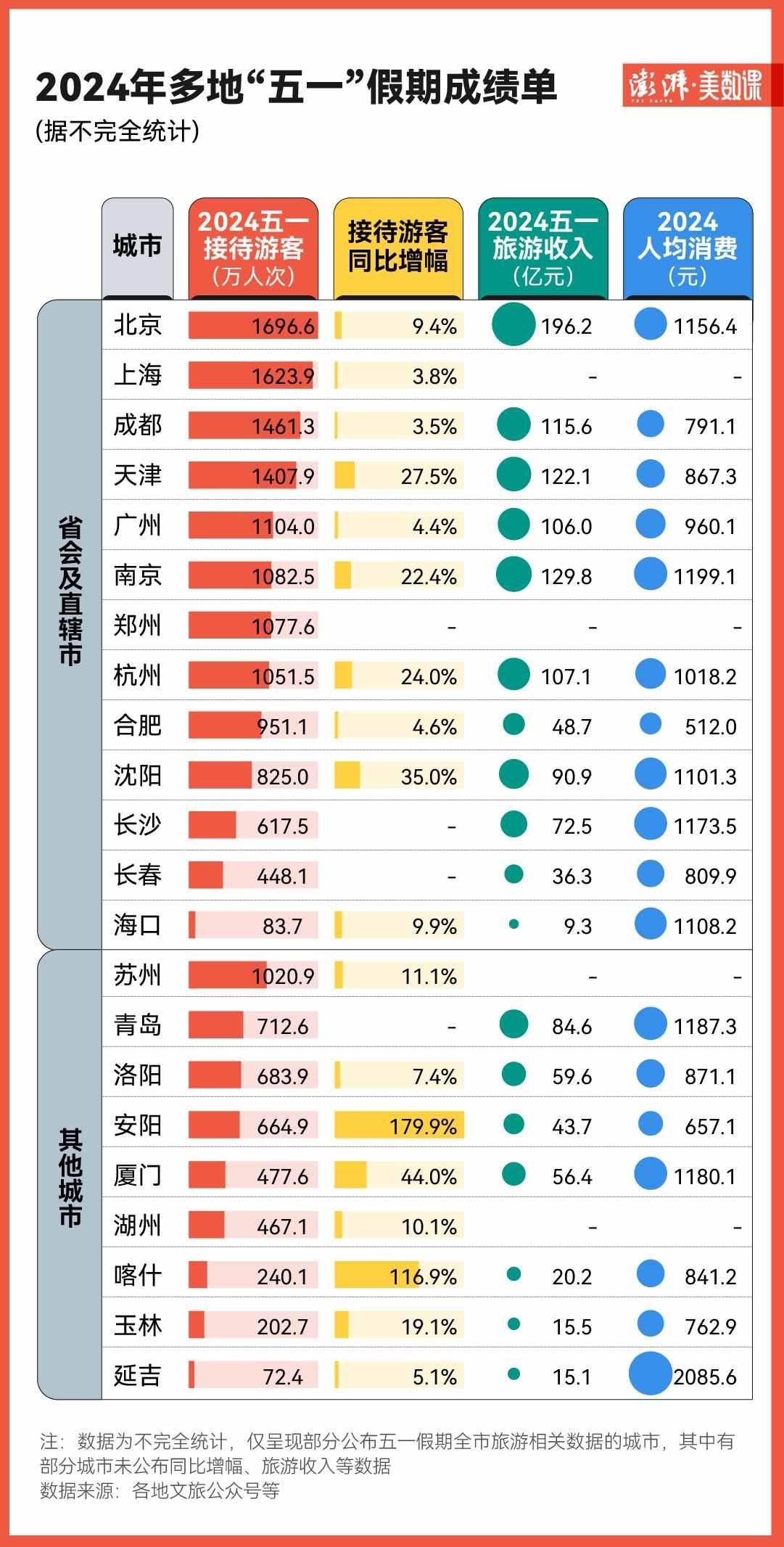 不過,像是北京、上海、成都、天津等城市依然是熱門的旅游目的地。在目前已公布“五一”假期數(shù)據(jù)的省會(huì)及直轄市中,北京、上海就以1696.6萬(wàn)、1623.9萬(wàn)接待游客人次名列前茅。