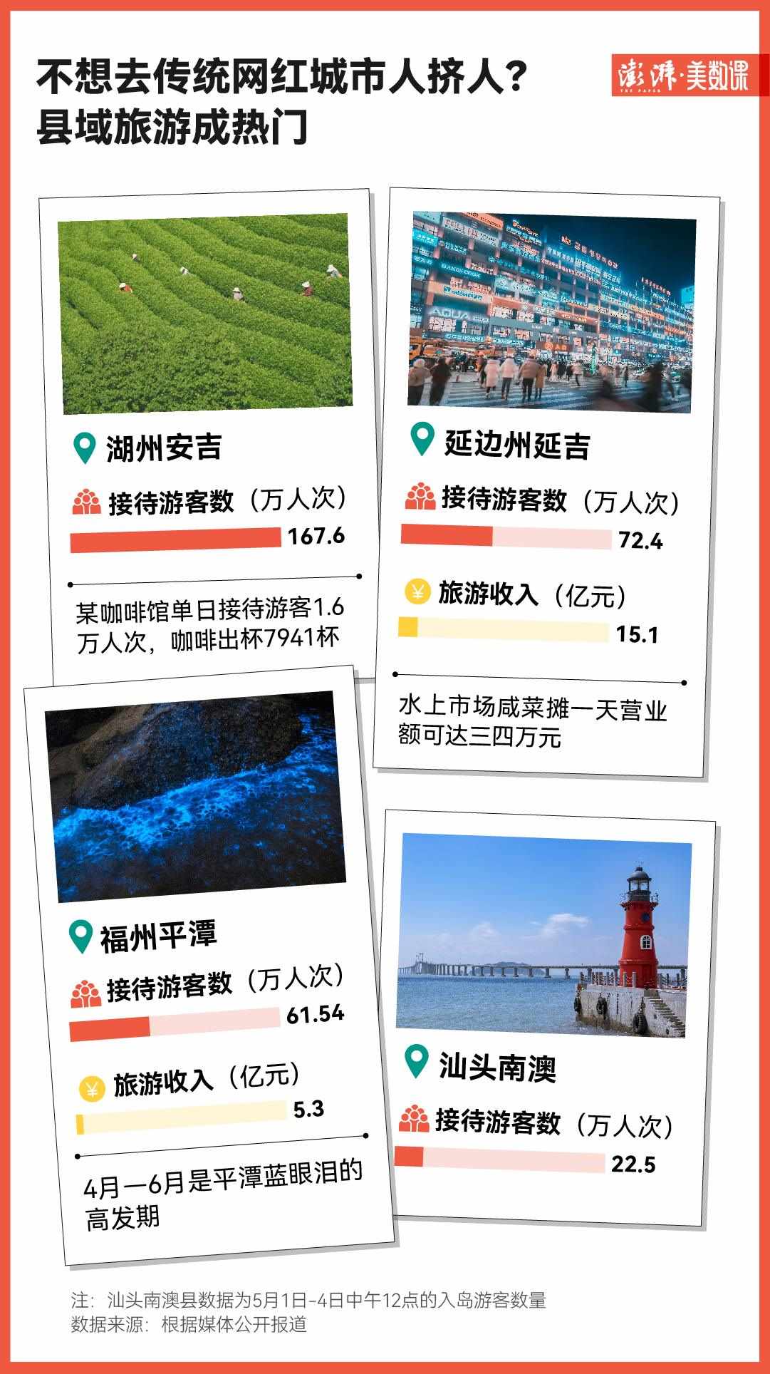 不僅如此,旅游下沉化的趨勢(shì)已經(jīng)來(lái)到了縣級(jí)市。湖州安吉在這個(gè)“五一”假期就收獲了167.6萬(wàn)人次的游客數(shù)量。據(jù)“安吉旅游”公眾號(hào),當(dāng)?shù)啬晨Х瑞^單日接待游客1.6萬(wàn)人次,咖啡出杯7941杯。