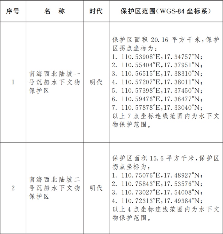 ·國(guó)務(wù)院核定公布南海西北陸坡一號(hào)、二號(hào)沉船水下文物保護(hù)區(qū)名單。
