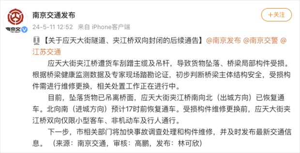 ·南京貨車側(cè)翻撞壞夾江大橋?官方通報:初步判斷橋梁主體結(jié)構(gòu)安全。