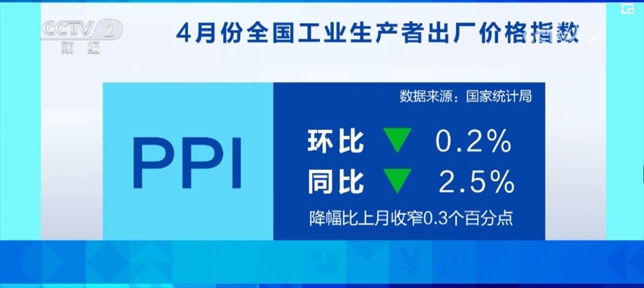 4月份,工業(yè)生產(chǎn)繼續(xù)恢復,全國工業(yè)生產(chǎn)者出廠價格指數(shù)PPI環(huán)比下降0.2%,同比下降2.5%,降幅比上月收窄0.3個百分點。