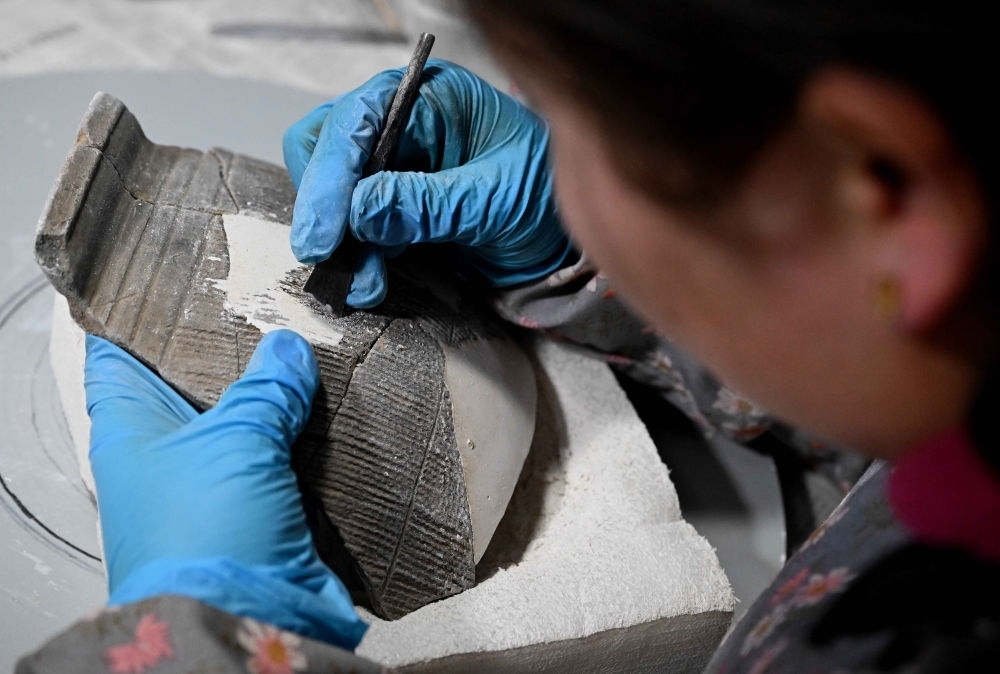 2024年2月23日,在中國(guó)社會(huì)科學(xué)院考古研究所安陽工作站,工作人員在整理修復(fù)殷墟洹北商城出土的陶片。