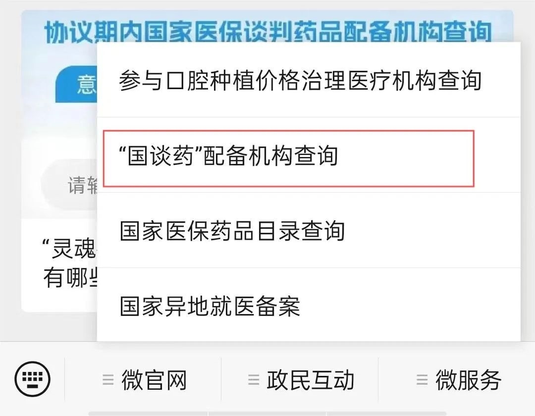 第一步:進(jìn)入“國(guó)家醫(yī)保局”微信公眾號(hào),點(diǎn)擊微服務(wù)→“國(guó)談藥”配備機(jī)構(gòu)查詢,進(jìn)入查詢頁(yè)面。