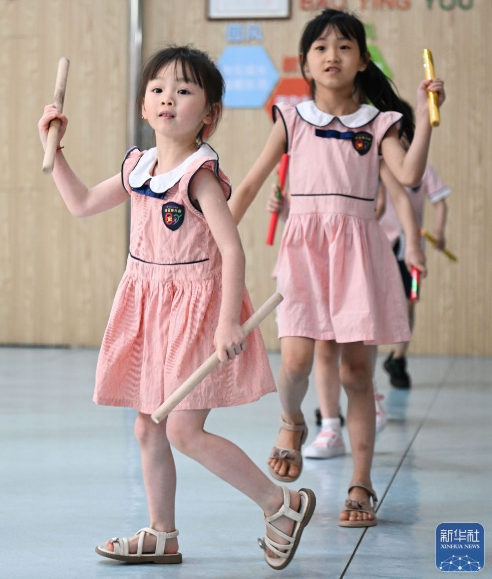 5月29日,在汕頭市貴嶼鎮(zhèn)北林保嬰幼兒園,莊恩琪練習跳英歌舞。