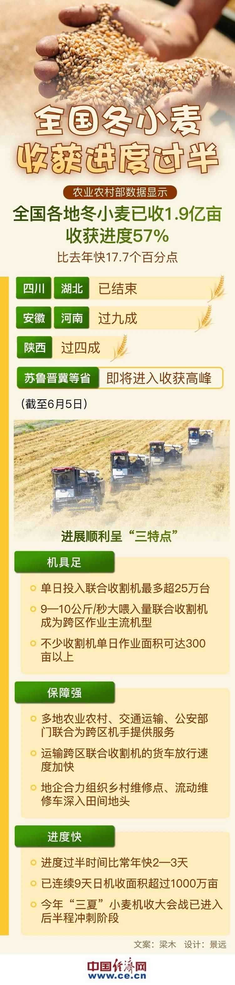 中國經(jīng)濟網(wǎng)6月6日訊 (記者 梁木) 當前,冬小麥機收正由南向北加快推進。截至6月5日,全國各地冬小麥已收1.9億畝、收獲進度57%,比去年快17.7個百分點。四川、湖北麥收已結(jié)束,安徽、河南進度過九成,陜西過四成,蘇魯晉冀等省即將進入收獲高峰。