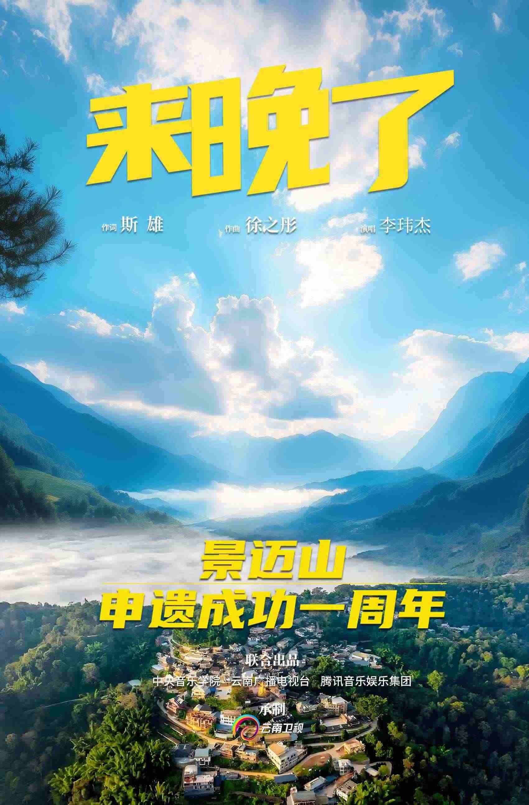 為慶祝景邁山申遺成功一周年,實(shí)景版MV《來晚了》上線啦!實(shí)景版歌曲由資深媒體人斯雄作詞,中央音樂學(xué)院徐之彤教授作曲,云南音樂人李瑋杰演唱。中央音樂學(xué)院、云南廣播電視臺、騰訊音樂娛樂集團(tuán)聯(lián)合出品,云南衛(wèi)視承制。