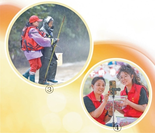 圖③:安徽省歙縣山越救援隊(duì)黨員(左)在轉(zhuǎn)移受災(zāi)群眾。樊成柱攝(影像中國) 圖④:新疆維吾爾自治區(qū)烏蘇市黨員志愿者到田間地頭直播銷售草莓。李仁錫攝(影像中國)