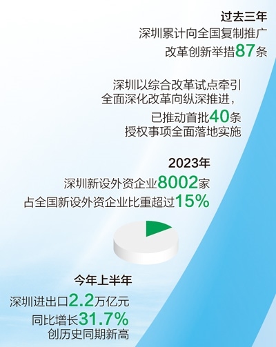 改革開放釋放澎湃動能。深圳發(fā)布支持外商投資生物醫(yī)藥領(lǐng)域、實(shí)施跨境貿(mào)易投資高水平開放政策試點(diǎn)等20條措施,出臺優(yōu)化國際化營商環(huán)境工作方案,持續(xù)提升對全球優(yōu)質(zhì)要素資源的強(qiáng)大吸引力。去年全年,深圳新設(shè)外資企業(yè)8002家,占全國新設(shè)外資企業(yè)比重超過15%;今年上半年,深圳進(jìn)出口總額2.2萬億元,同比增長31.7%,創(chuàng)深圳歷史同期新高。