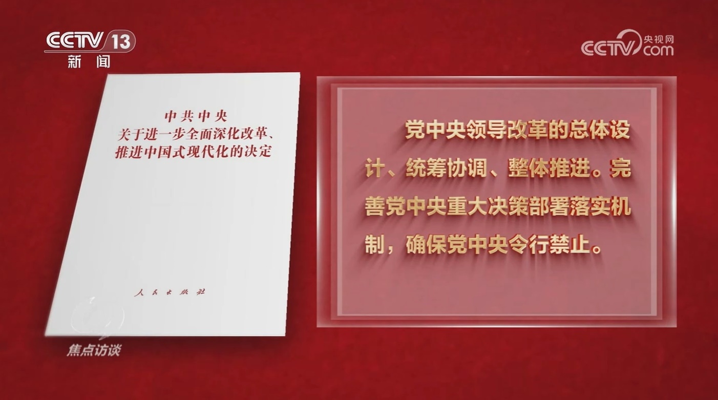 《決定》提出:黨中央領(lǐng)導(dǎo)改革的總體設(shè)計、統(tǒng)籌協(xié)調(diào)、整體推進。完善黨中央重大決策部署落實機制,確保黨中央令行禁止。