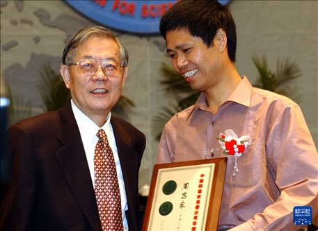 2003年9月13日,在中國(guó)科學(xué)技術(shù)協(xié)會(huì)2003年學(xué)術(shù)年會(huì)開幕式上,周光召同志為周忠良(右)等15人頒發(fā)中國(guó)科協(xié)“求是杰出青年獎(jiǎng)”。