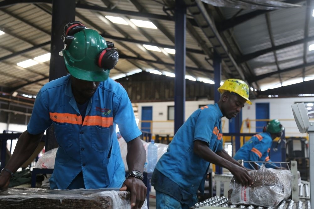 2024年6月10日,在科特迪瓦南部城鎮(zhèn)達布郊區(qū),工人們在美蘭橡膠加工廠對成品橡膠進行打包。中國加工廠幫助科特迪瓦橡膠增加產(chǎn)品附加值,提高膠農(nóng)收入。
