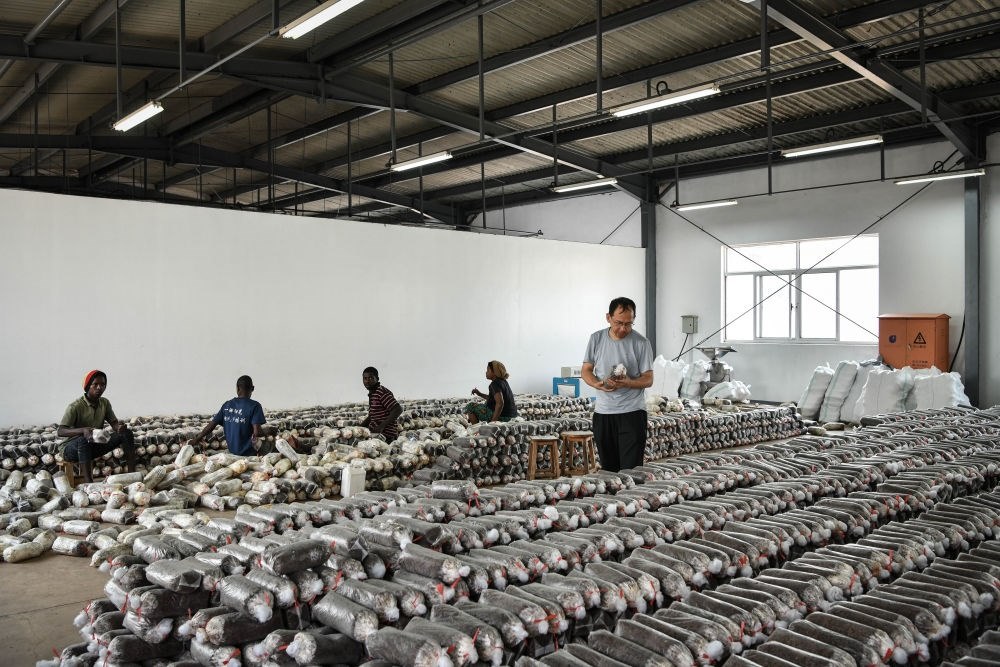 2024年8月13日,在盧旺達南方省胡耶區(qū)的中國援盧農(nóng)業(yè)技術(shù)示范中心,菌草專家陳曉斌(右)檢查菌袋。自菌草技術(shù)引入盧旺達以來,當(dāng)?shù)鼐莓a(chǎn)業(yè)發(fā)展迅速,不僅為市場提供了豐富的食用菌產(chǎn)品,還創(chuàng)造了大量就業(yè)機會。