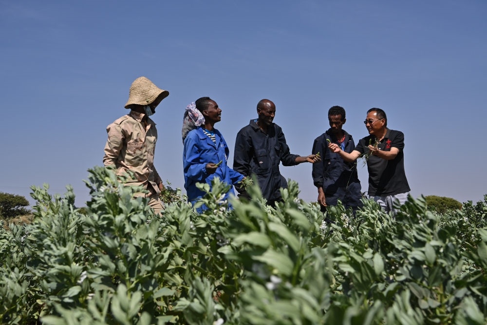 2023年9月27日,在位于厄立特里亞阿斯馬拉的農(nóng)業(yè)技術(shù)援助項目示范地,中國援厄第三期高級農(nóng)業(yè)專家組豆類作物專家劉運民(右一)與當(dāng)?shù)剞r(nóng)戶交流。為推動厄立特里亞農(nóng)業(yè)產(chǎn)業(yè)發(fā)展,中國農(nóng)業(yè)農(nóng)村部已派出多批專家在厄立特里亞開展涉及豆類作物、果樹園藝、油料等領(lǐng)域的技術(shù)援助工作。