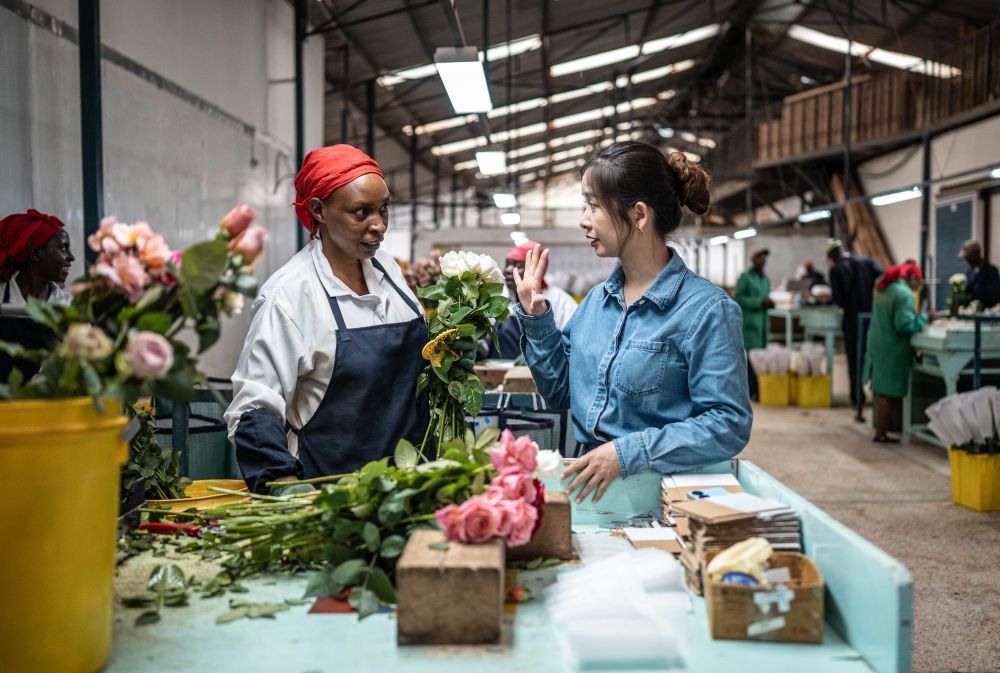 2024年5月18日,湖南璽悅國際貿(mào)易有限公司負責(zé)人黃梓楠(右)在肯尼亞納紐基的坦布濟花卉農(nóng)場挑選鮮花。中國政府2021年11月宣布為非洲農(nóng)產(chǎn)品輸華建立“綠色通道”,縮短檢驗檢疫時間,擴大關(guān)稅豁免,為肯尼亞鮮花及非洲各國的牛油果、柑橘、菠蘿等特色農(nóng)產(chǎn)品打開了銷路。
