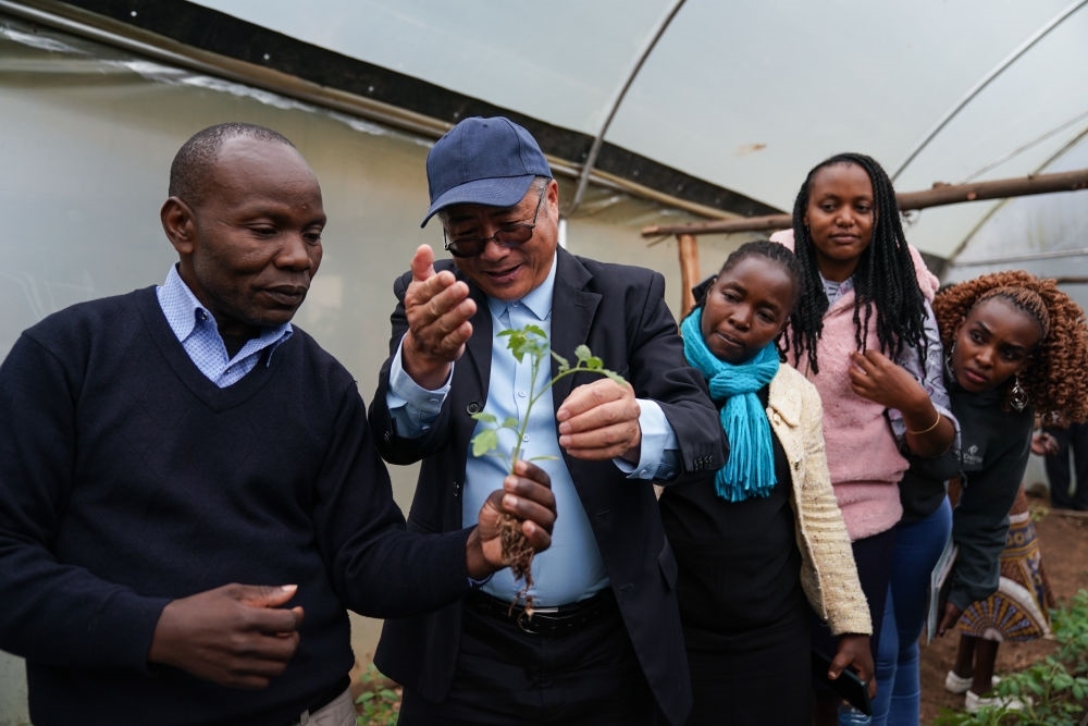 2023年9月18日,在肯尼亞納庫魯郡舉辦的中非農(nóng)業(yè)發(fā)展和減貧示范村番茄生產(chǎn)培訓(xùn)班上,來自中國的農(nóng)學(xué)教授劉高瓊(左二)為肯方學(xué)員指導(dǎo)農(nóng)業(yè)技術(shù)。多年來,中國農(nóng)業(yè)專家在當(dāng)?shù)亻_展了知識培訓(xùn)、技術(shù)指導(dǎo)和農(nóng)業(yè)設(shè)施修繕等工作,有效助力中國先進的農(nóng)業(yè)技術(shù)在納庫魯?shù)貐^(qū)的示范推廣,幫助農(nóng)民實現(xiàn)增收減貧的目標(biāo)。