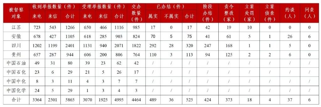 截至10月30日20時,各督察組共收到群眾來電、來信舉報(bào)5865件,受理有效舉報(bào)4995件,經(jīng)梳理合并重復(fù)舉報(bào),累計(jì)向被督察對象轉(zhuǎn)辦4464件。被督察對象已辦結(jié)或階段辦結(jié)949件,其中立案處罰18家;立案偵查4件;約談黨政領(lǐng)導(dǎo)干部37人,問責(zé)黨政領(lǐng)導(dǎo)干部6人。