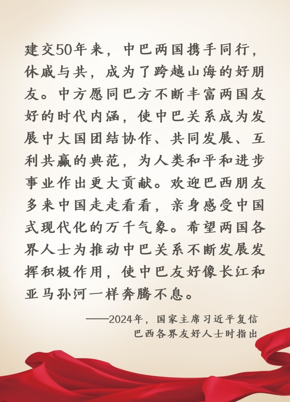 2023年4月,習(xí)近平主席同來華進行國事訪問的巴西總統(tǒng)盧拉舉行會談時,談到雙方要以2024年慶祝建交50周年為契機,繼續(xù)推動中巴友好。