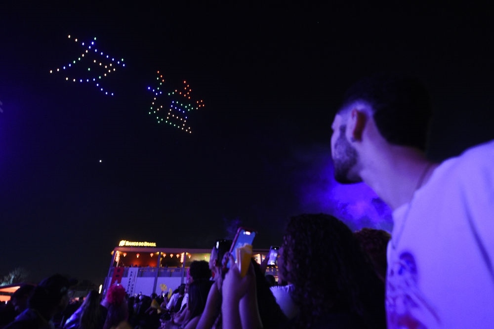 2024年8月17日,在巴西首都巴西利亞,人們在沙灘藝術(shù)節(jié)中國日活動上觀看無人機表演。